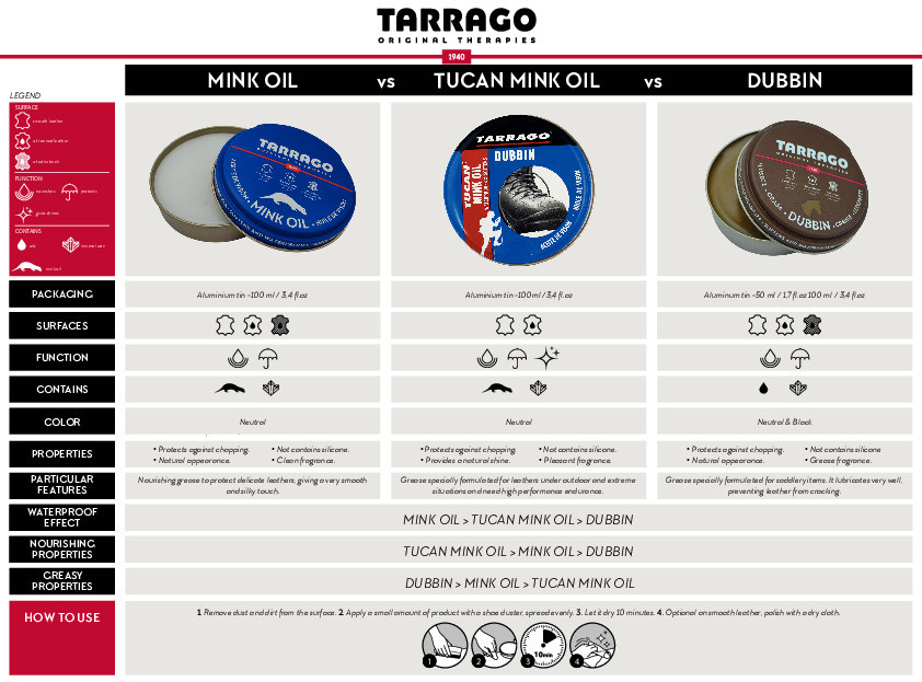 Tarrago Mink Oil is enriched with natural mink oil and mineral waxes. It protects and nourishes the leather, preventing against chapping and ensuring waterproof protection.